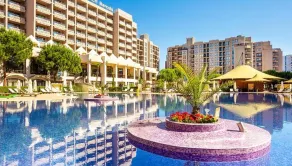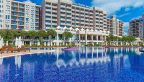 KING REAL ponúka na predaj kompletne zariadený apartmán 2kk v komplexe Royal Beach Barcelo na Slnečnom pobreží len 30 km od letiska v Burgase. Apartmán má rozlohu 72m2, nachádza sa na 8. poschodí s výťahom a terasou s výhľadom na hory a čiastočne more. Vzdialenosť od mora je len 70 metrov.