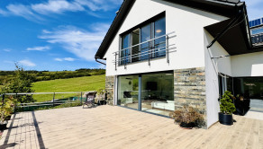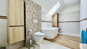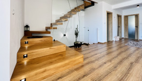- vykurovanie: podlahové vodné kúrenie cez tepelné čerpadlo v kombinácii s fotovoltaikou a kotlom na tuhé palivo, rohový krb na drevo