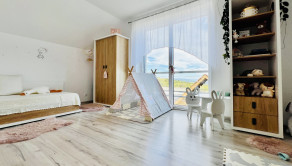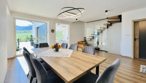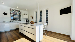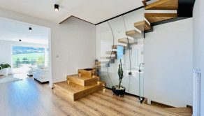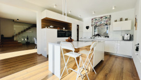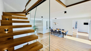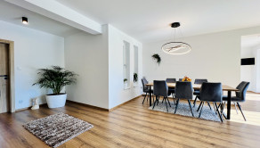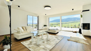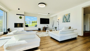 Dom disponuje dvojgarážou, technickou miestnosťou a priestrannou terasou, ktorá je ako stvorená na relax. Podlahové kúrenie, inteligentný systém riadenia domu cez aplikácie a moderný rohový krb na drevo z neho robia nehnuteľnosť bez kompromisov.