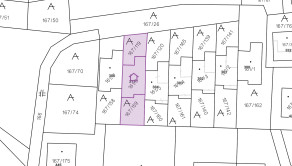 Rovinatý pozemok má celkovú rozlohu 174 m², zozadu je vyvýšený a oplotený a z prednej časti k nemu prislúcha parkovanie na zdieľanom pozemku pred objektom. Prístupová cesta je panelová, celoročne zjazdná.