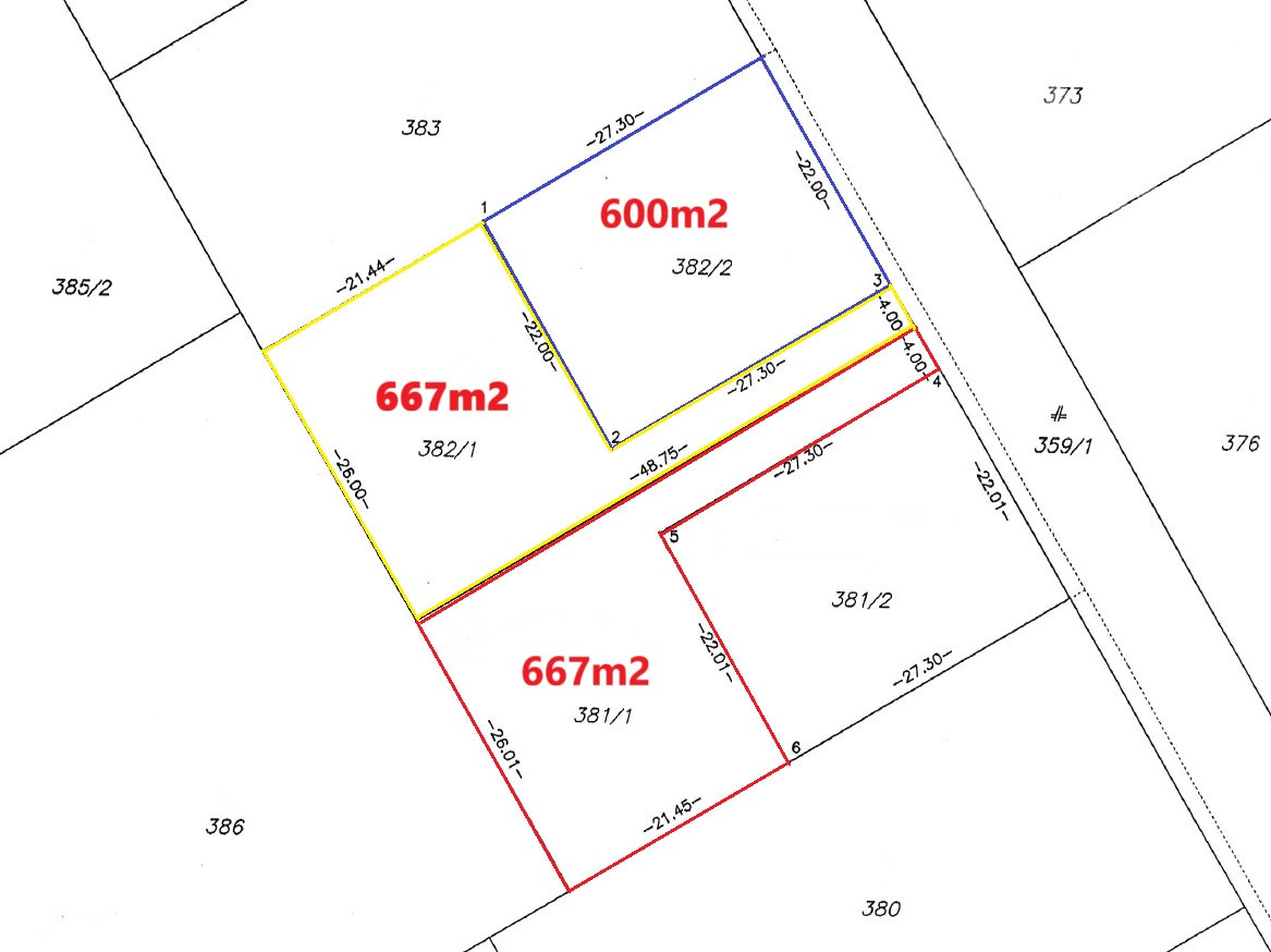 - parc. č. 382/2 – 600 m2 - 96 500 EUR (160,83 eur/m2) – VOĽNÉ