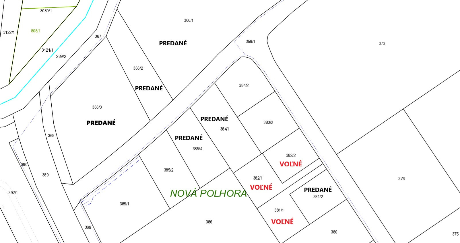 - parc. č. 382/1 – 667 m2 - 90 210 EUR (135,24 eur/m2) - VOĽNÉ