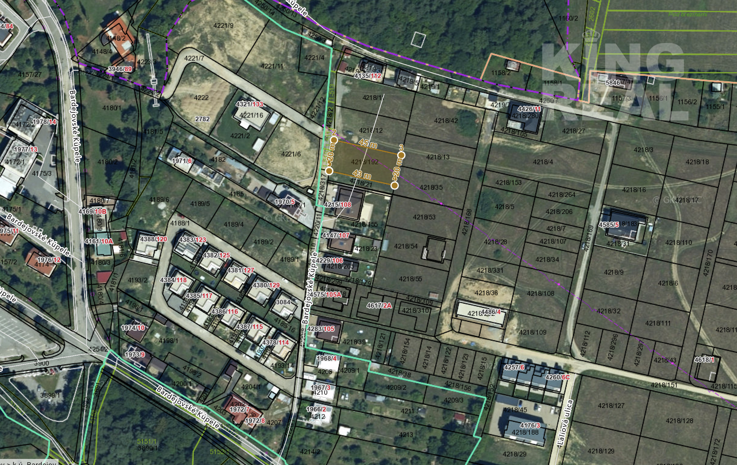 KING REAL exkluzívne ponúka na predaj stavebný pozemok v Bardejovských Kúpeľoch o rozlohe 870 m2. Rozmery pozemku: (šxd) 20 m- 45 m. Podľa územného plánu mesta Bardejov toto územie slúži výlučne na bývanie, s doplnkovými funkciami kúpeľno-rekreačného ubytovania a rekreačných služieb.