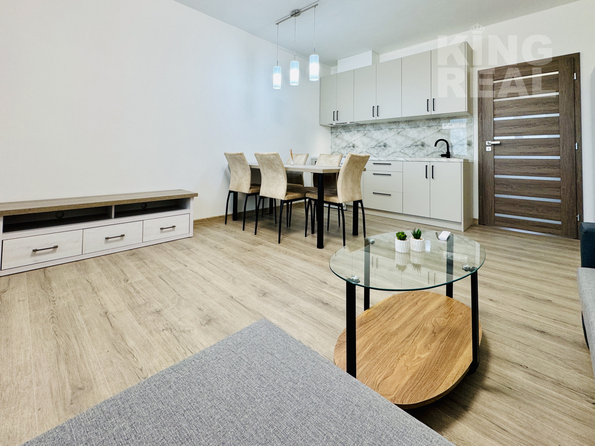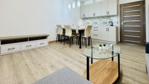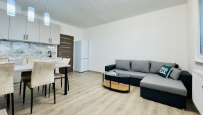 • obývačka prepojená s kuchyňou – moderná kuchynská linka, plynový sporák, chladnička s mrazničkou, jedálenský stôl, gauč, konferenčný stolík a úložný nábytok
