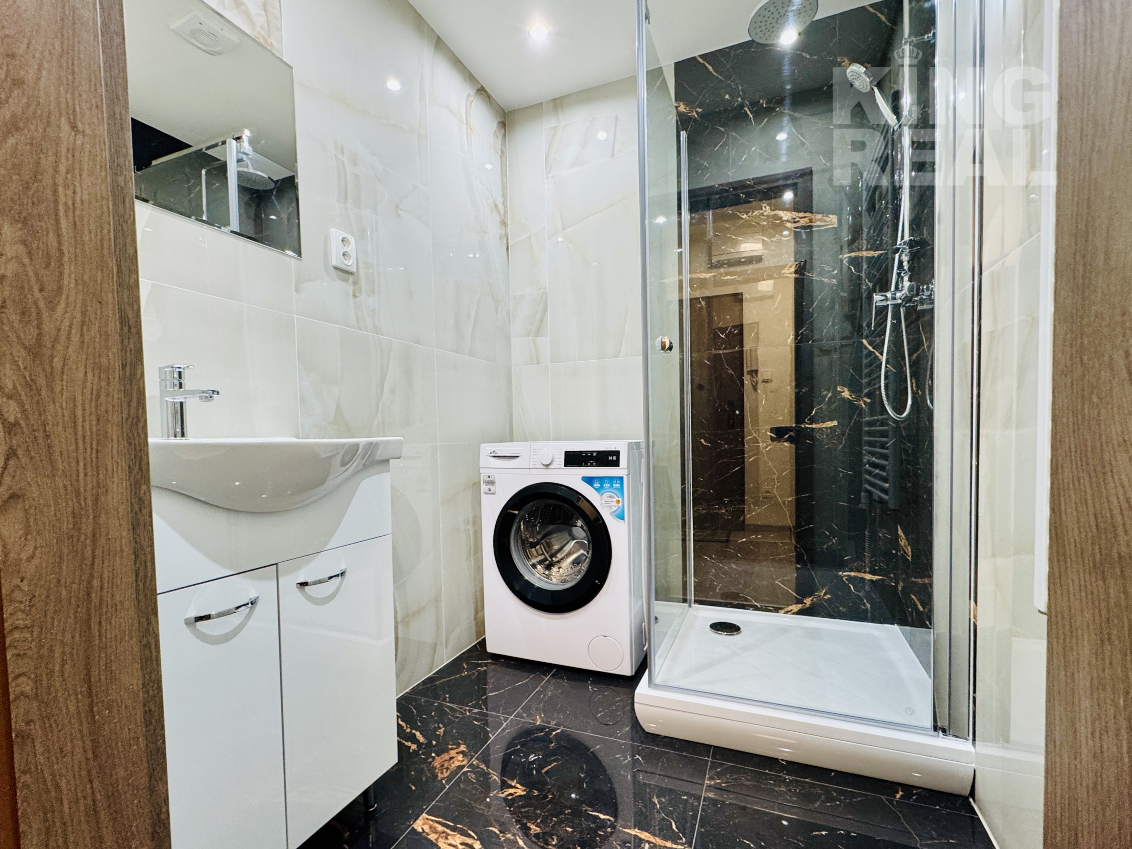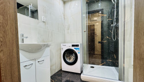 • kúpeľňa – sprchový kút, umývadlo so skrinkou, zrkadlo, elektrický radiátor, práčka